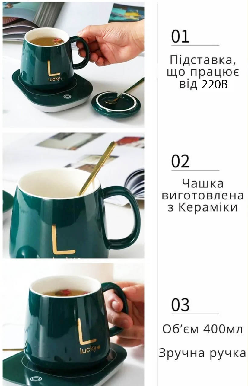 Чашка з підігрівом є новинкою в нашому житті, адже кожен з нас любить зручності і це воно. Керамічна чашка з кришкою високої якості, підставка для підігріву оригінальна з сенсорним покажчиком нагріву працює від 220В, в комплекті кавова ложечка.